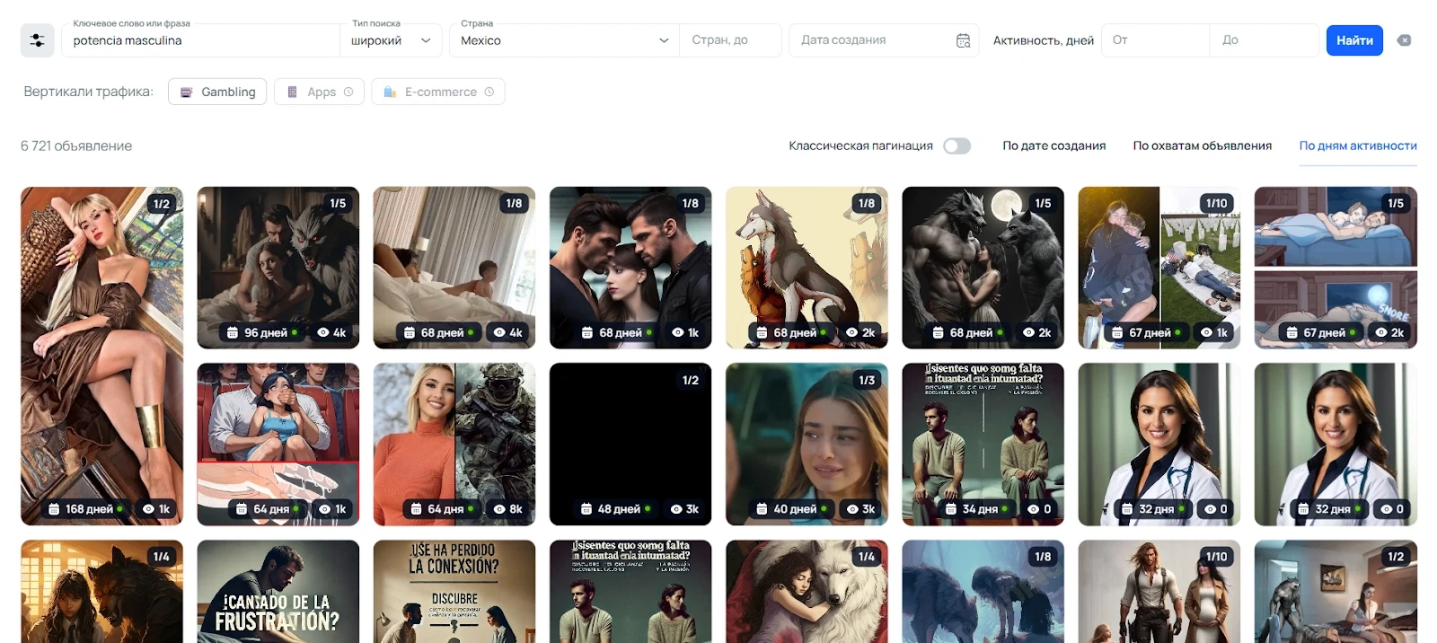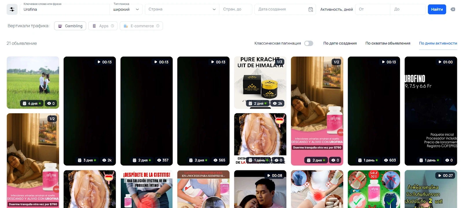 Например, если дать по Мексике запросы «cistitis» или «potencia masculina», выходит много нецелевых объявлений от клиник, врачей, блогеров и т.п. Креативы арбитражников среди них теряются.