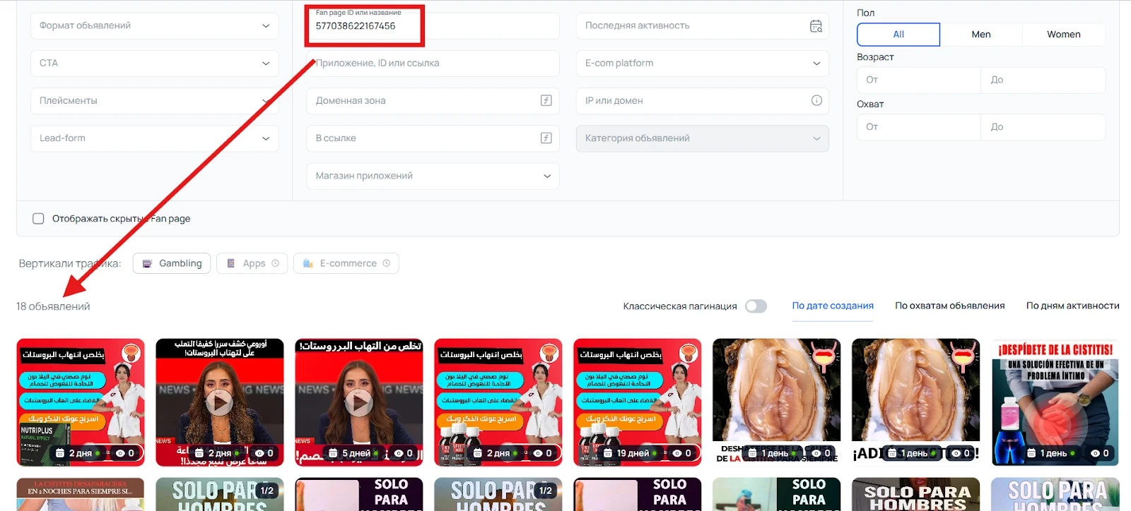- Нажать на любое из них и в новой вкладке откроются все креативы, запущенные с одной фанпейдж.