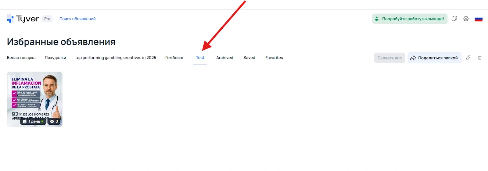Чтобы сохранить в другой папке, жмете на ту же кнопку «Добавить в избранное». В верхнем правом углу всплывет уведомление со ссылкой на папку назначения. Для примера сохраним другое крео в папке «Test».
