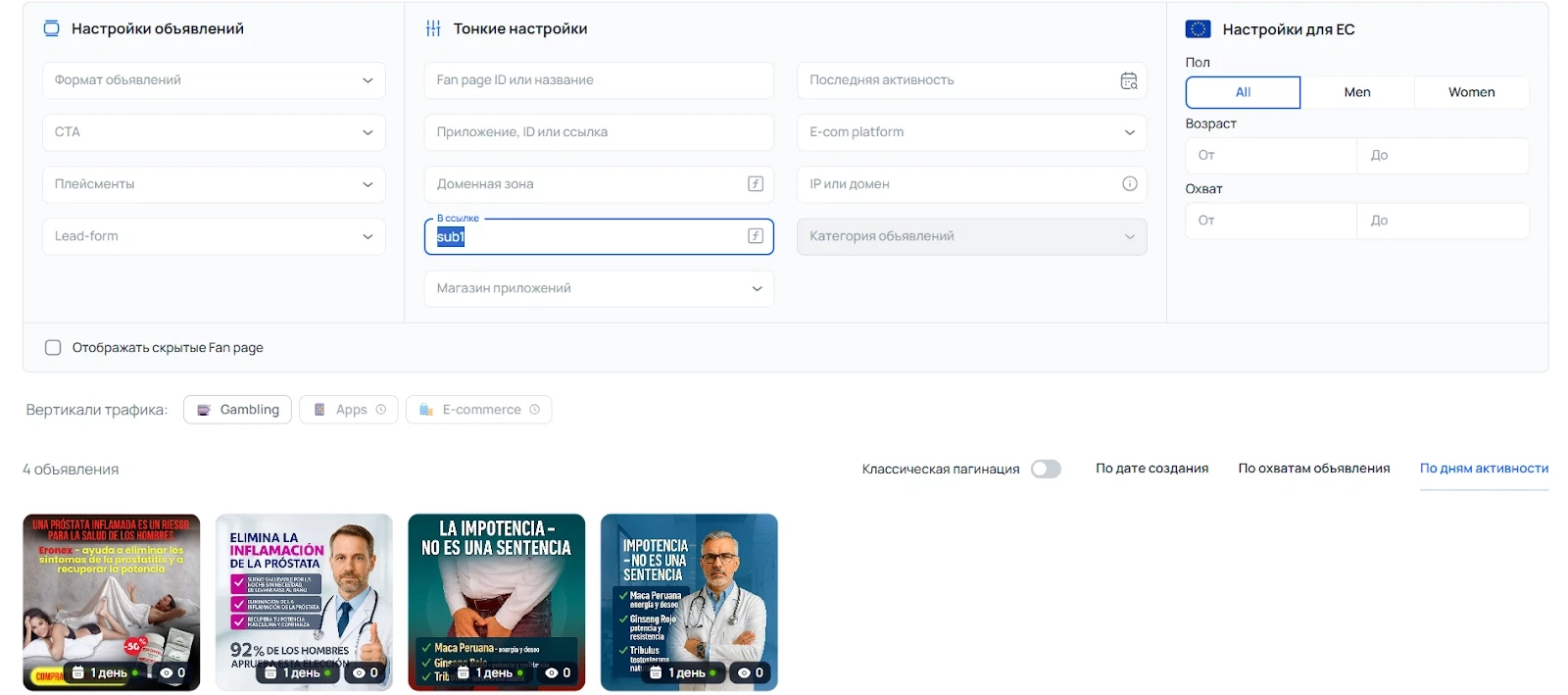 Процент выдачи арбитражных креативов можно увеличить, если при поиске по ключевикам использовать UTM-метки, характерные для арбитражников (Tyver позволяет проводить поиск по фрагментам ссылок). Для примера пропишем идентификатор «sub1» в том же поиске по запросу «potencia masculina».