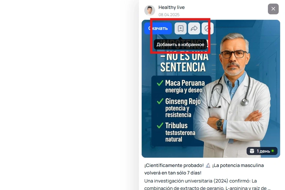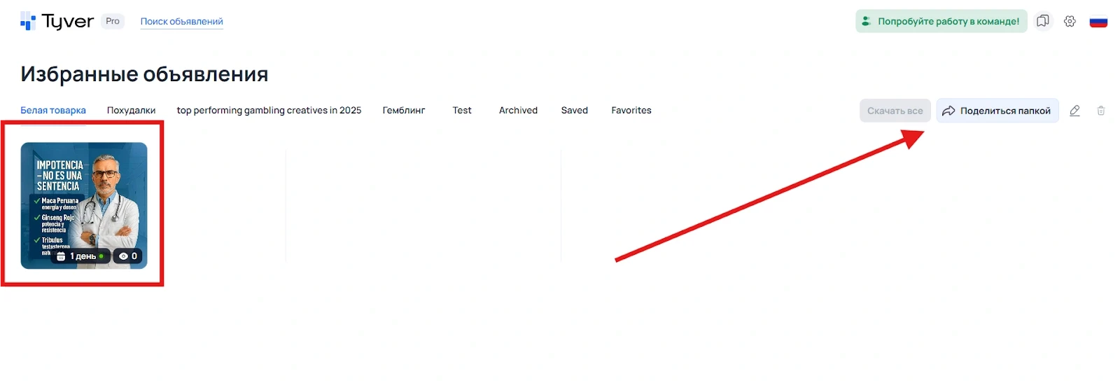Рассмотрим сохранение и передачу креативов на примере Tyver — в других спай-сервисах эти опцию работают похожим образом. Для сохранения крео нужно его добавить в избранное. Плашка для добавления находится сверху каждого объявления.