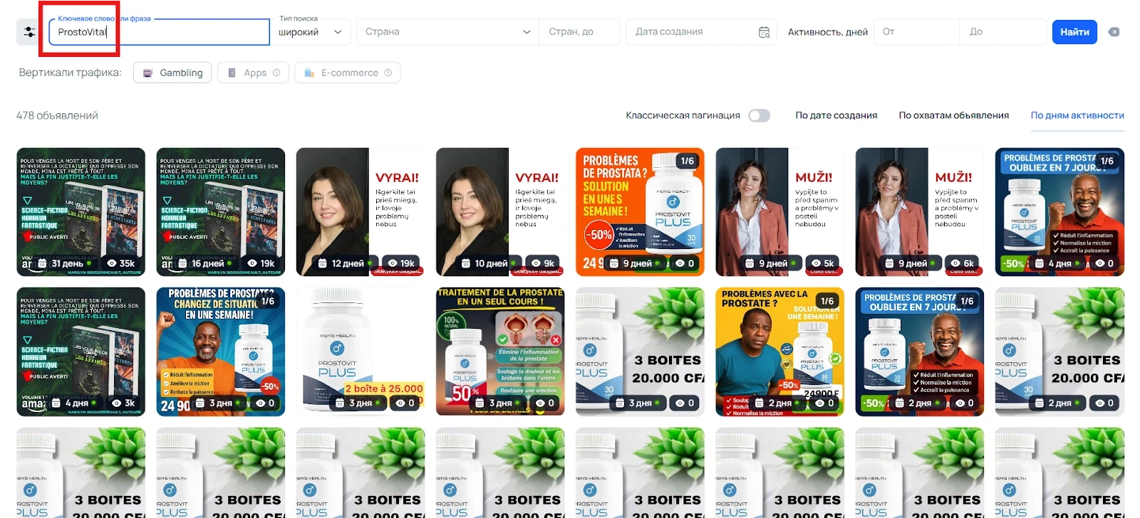 К нему стоит прибегать, если поиск по названию офферов не дает никаких результатов. Дело в том, что сначала придется подобрать ключевики, а затем понадобится каждый из них прогнать по поиску. Очевидные ключевые слова, например, цистит или мужская потенция, не всегда дают желаемый результат, потому что по ним часто выходят нерелевантные объявления.